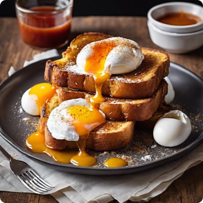 Thick slices of milk-soaked bread, golden-fried to perfection, dusted with powdered sugar, and served with maple syrup.